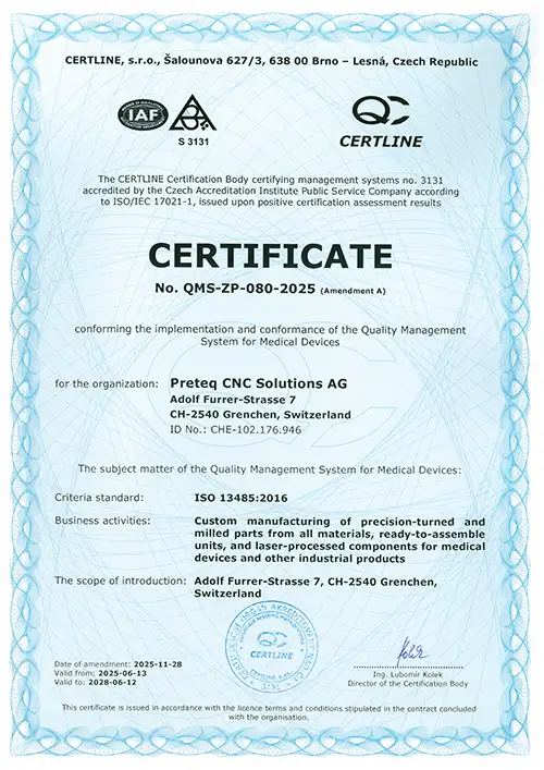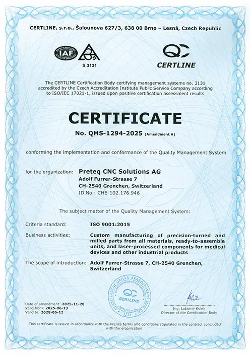 Preteq CNC Solutions combines over a hundred years of industrial experience with state-of-the-art manufacturing technology. At our locations in Switzerland and Czechia, we work as an international team to make precision a reliable promise.